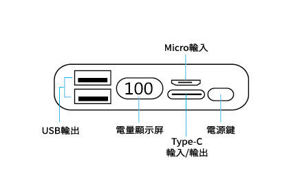 3.行動電源電量數字顯屏由1-100數字顯示目前電量百分比,當數字達到5%以下,請盡速爲行動電源補充電源。