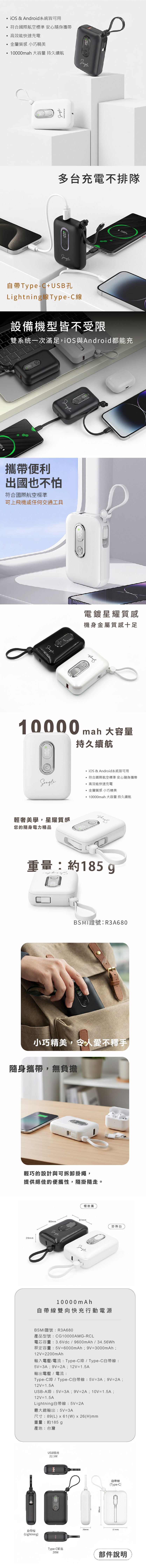 Starshine星耀Mini快充行動電源|耀石黑|客製化服務|1萬mAh|自帶雙線 (Lightning與typeC)|台灣製造與合格認證