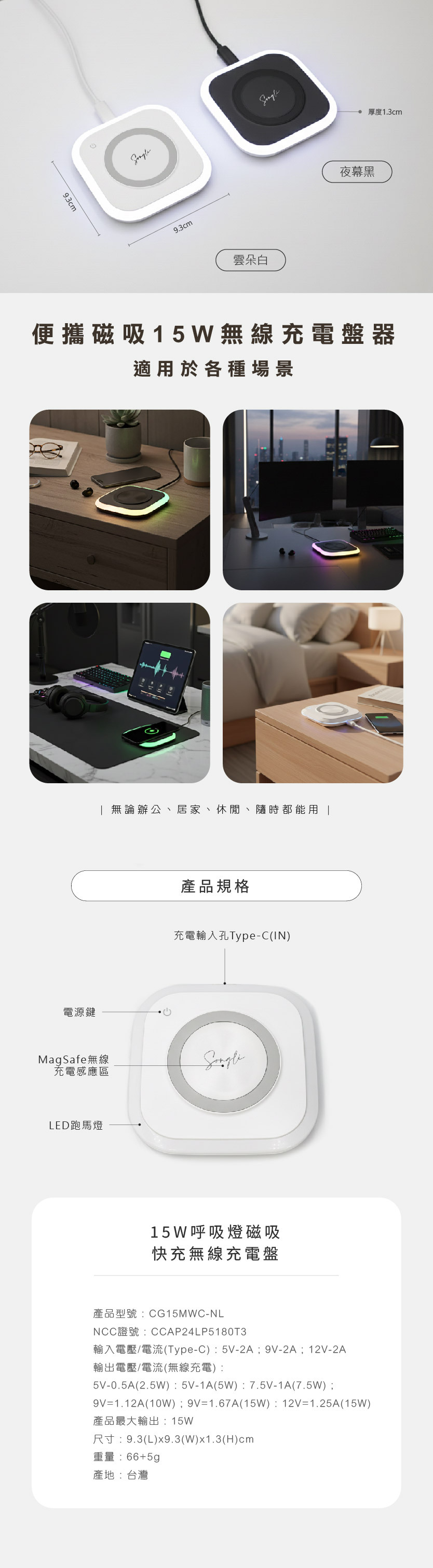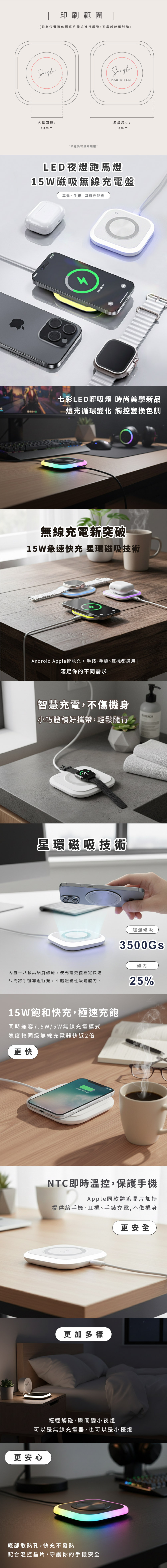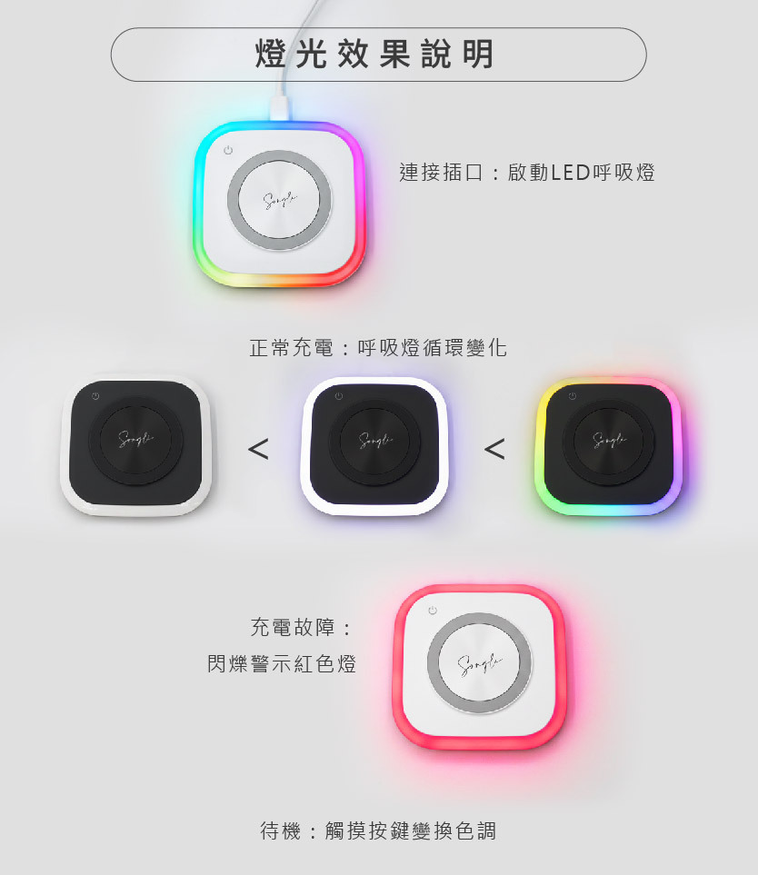 15W三用磁吸無線充電器|客製化鐫刻|三種燈光模式、隨心切換|漾彩呼吸燈|夜燈模式|無光模式