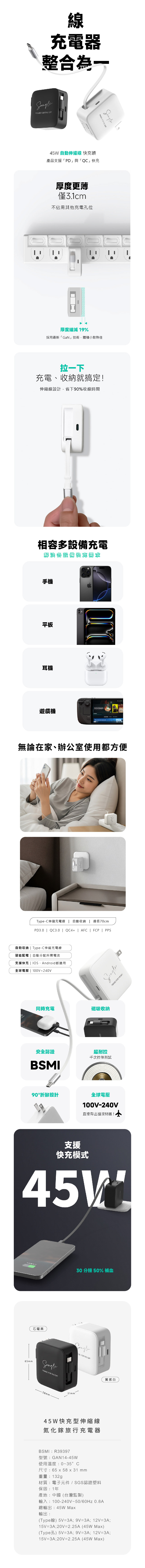 GaN14-45W快充氮化鎵旅行充電器(黑)|自帶typec伸縮線|客製化印刷|禮物包裝|台灣知名品牌POLYBATT 製造